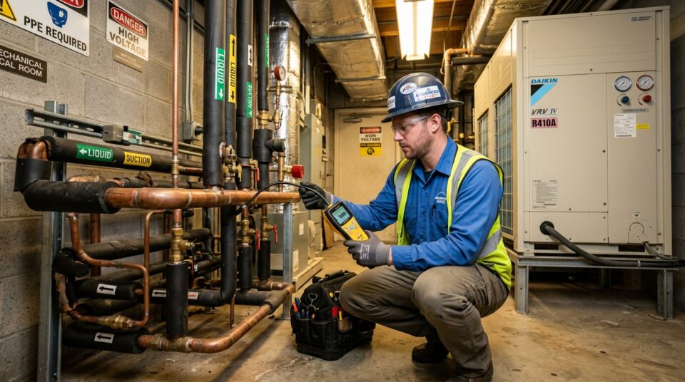 If you manage a building with a VRF system, refrigerant leaks are one of the most expensive problems you can ignore. By the time you notice the system isn’t keeping up, you could be down several pounds of R-410A at $50-75 per pound, and the compressor has been working overtime trying to compensate.